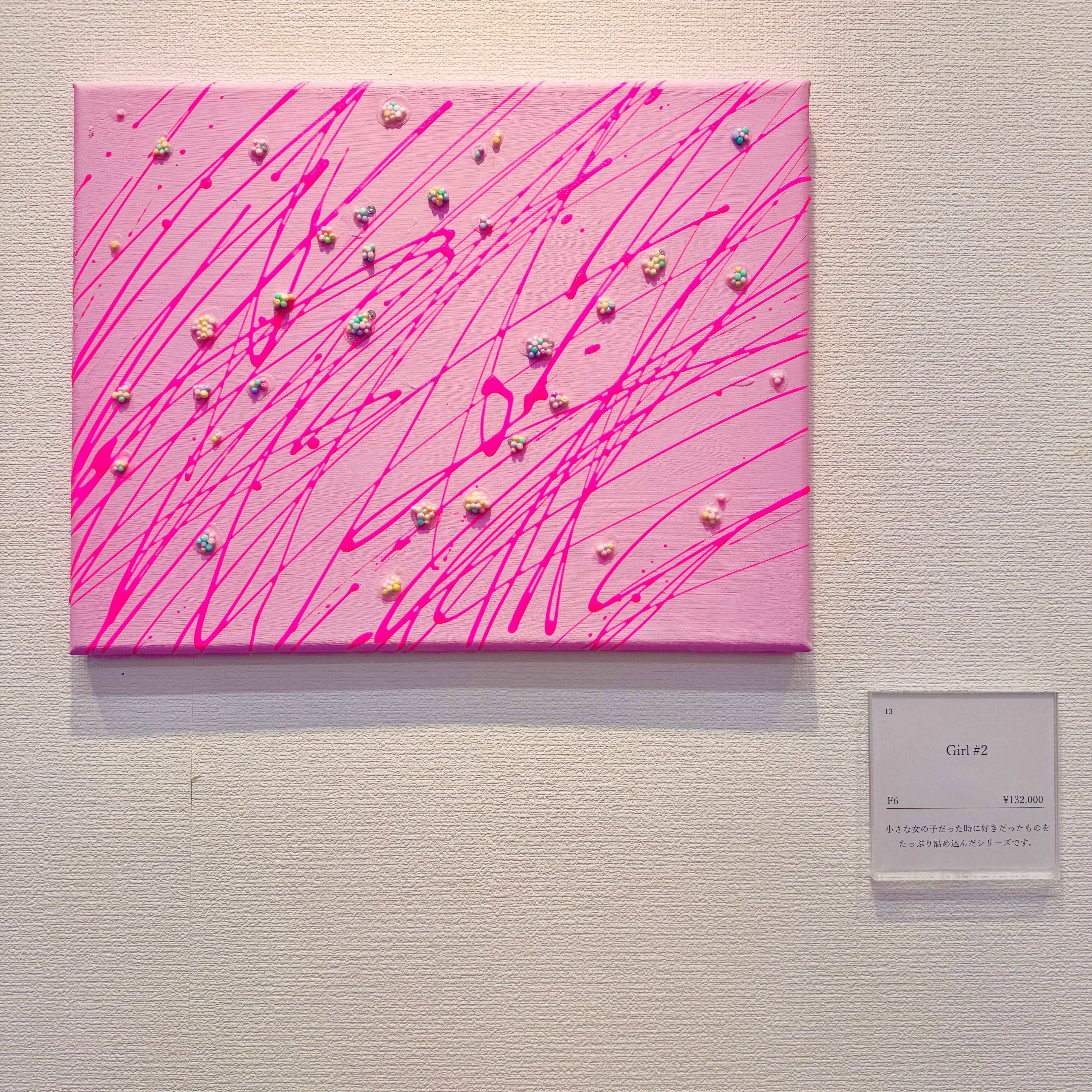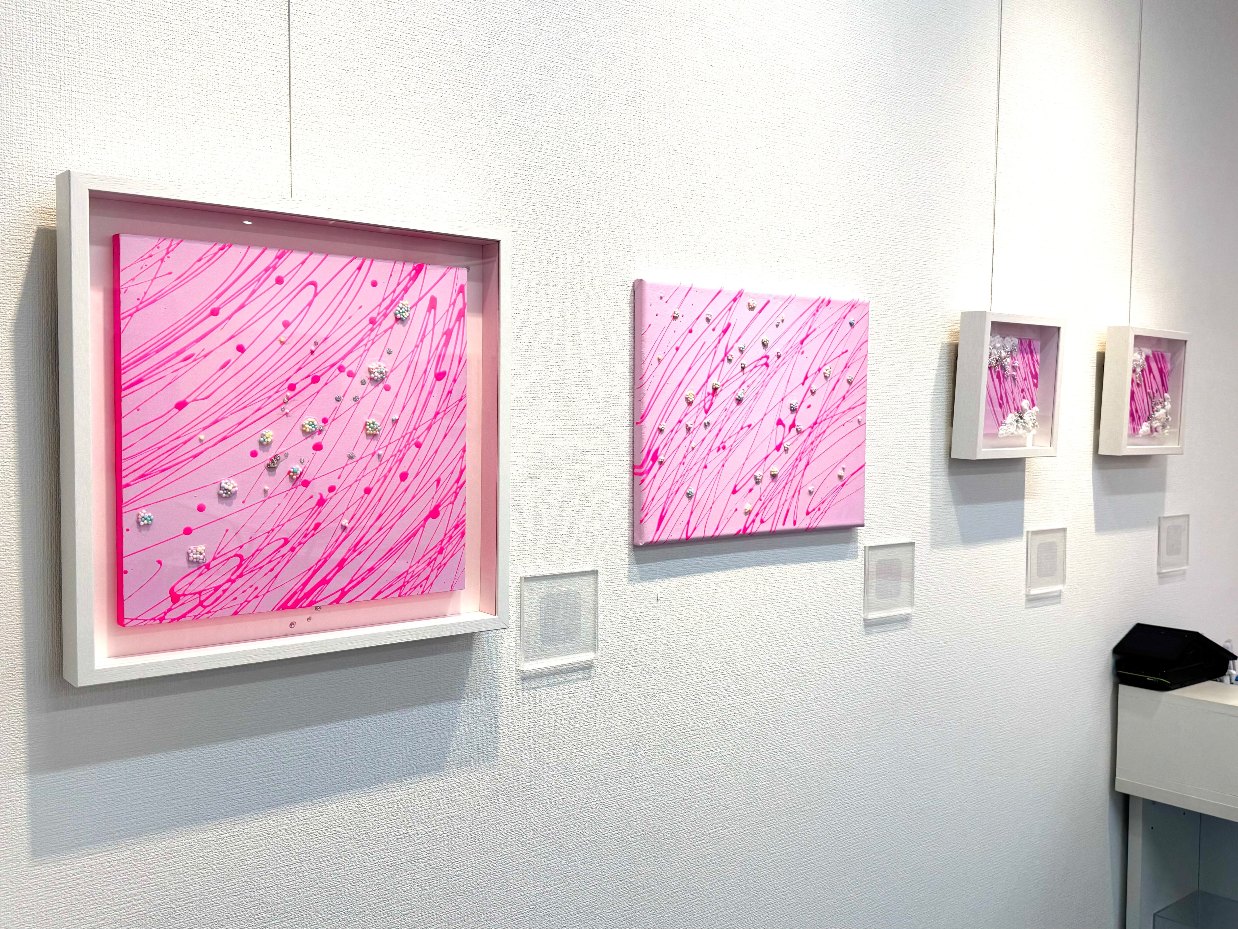 この作品で使用した透明なピンクのラインは、子供の頃に持っていたビニールの水泳バッグや浮き輪やペンケース、駄菓子屋さんで売ってたお菓子やシロップなど、大好きだった素材感を思い起こして描写しています。